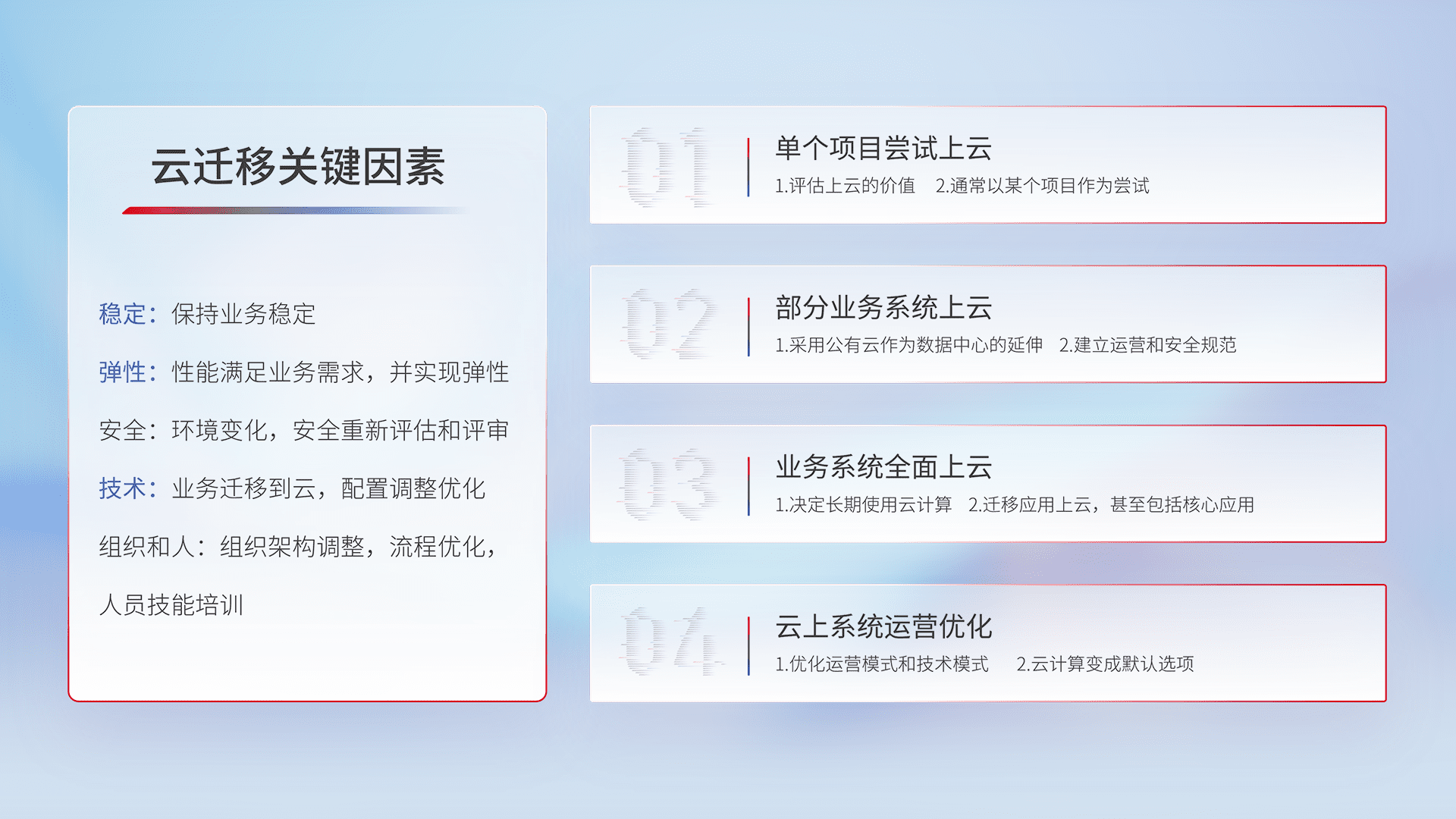 结合实际业务,,从规划设计、、、、云平台选型、、云原生改造、、数据迁移、、、、集成交付,,迁移全过程为客户识别最佳上云路径,,,做好风险识别管理,,,设计网络架构、、、、身份权限、、、、安全审计合规、、、、操作审计、、日志审计、、监控告警策略、、多站点容灾设计等,,对云上基础设施进行整体规划,,提升IT治理水平,,,以满足弹性、、、、高可用、、、高性能的需求。。。。
