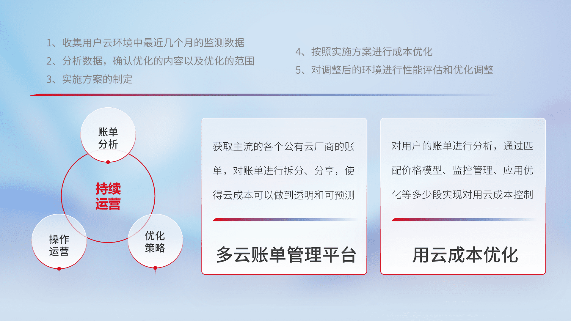 通过多云纳管,,以统一的资源数据模型把客户的云资源进行抽象和封装,,,,进而实现对多云资源的统一操作,,,保障云资源管理的可靠性、、、、稳定性与可用性。。。。量身定制化运维内容,,,,配置、、、开发运维、、补丁管理、、、备份、、监控、、、认证和访问管理、、、审计和日常巡检等,,,保障在用云过程中的可靠度,,,,稳定度以及高可用率。。。。