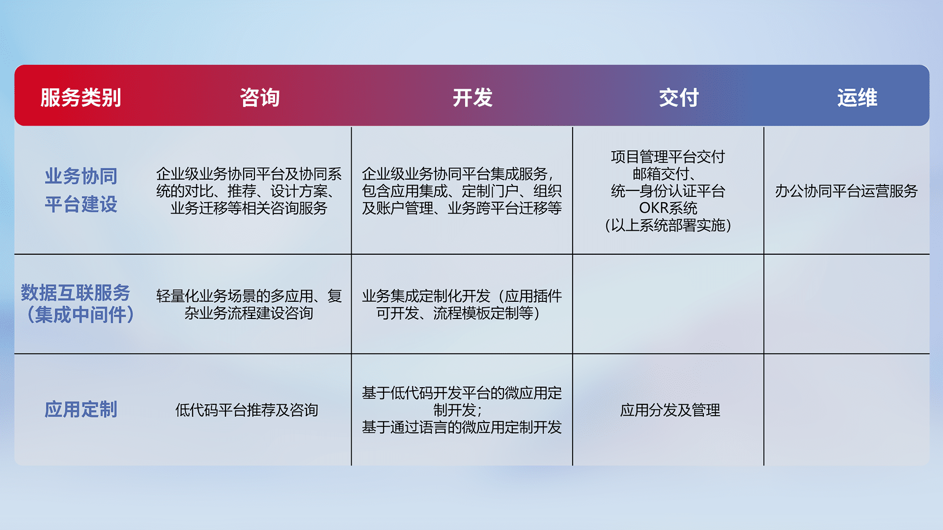 针对钉钉、、、企微、、、、IDaas等平台级产品提供产品的规划、、、、方案、、、交付、、、、定制化开发等服务,,,,实现如统一协同办公、、智能客户服务、、、、混合会议管理、、、、智能数据查询、、、、等业务场景,,,实现数字化转型。。。